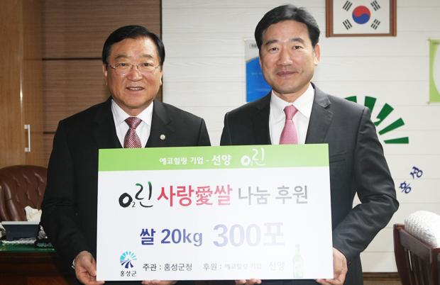 (주)선양의 박근태 사장 및 임직원들이 지난 12일 홍성군청 군수실을 방문해 지역의 어려운 이웃들을 위해 써달라며, 1800만원 상당의 문구용품 400세트와 쌀 6000kg(20kg 300포)을 기탁했다.