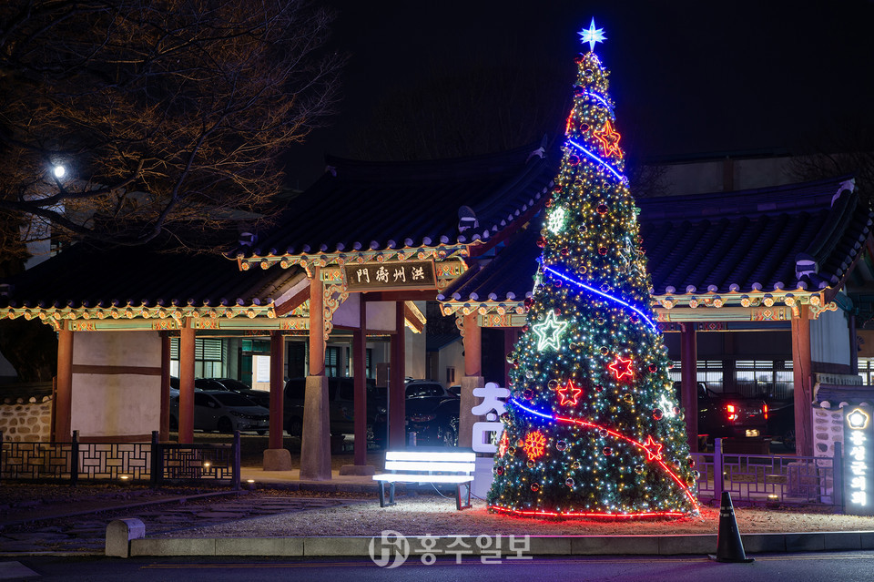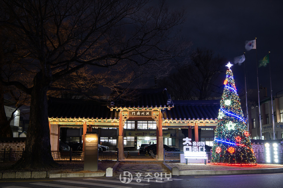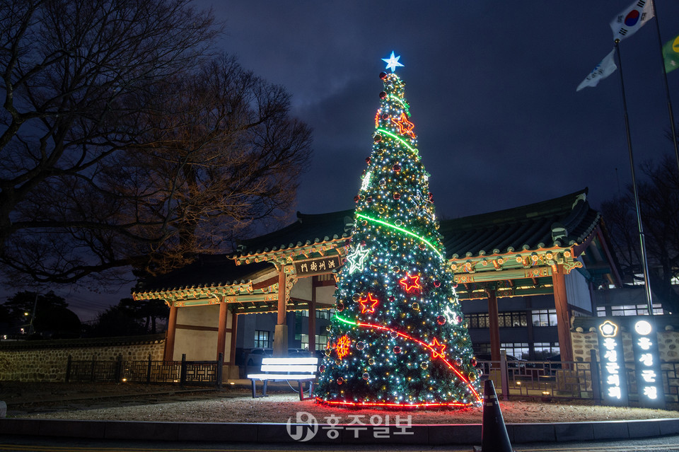 다가오는 성탄절과 연말연시를 맞아 군민들에게 희망과 위로의 메시지를 전하고자 군청 앞 홍주아문에 대형 크리스마스트리가 설치됐다. 높이 7m, 폭 4m 규모의 대형트리는 내년 1월 31일까지 약 2개월간 홍성군민들에게 성탄의 기쁨과 2024 갑진년(甲辰年) 새해 희망의 메시지를 전달할 예정이다. 트리 주변에는 야간조명과 조형물, 벤치 등을 함께 설치해 포토존을 조성했다.