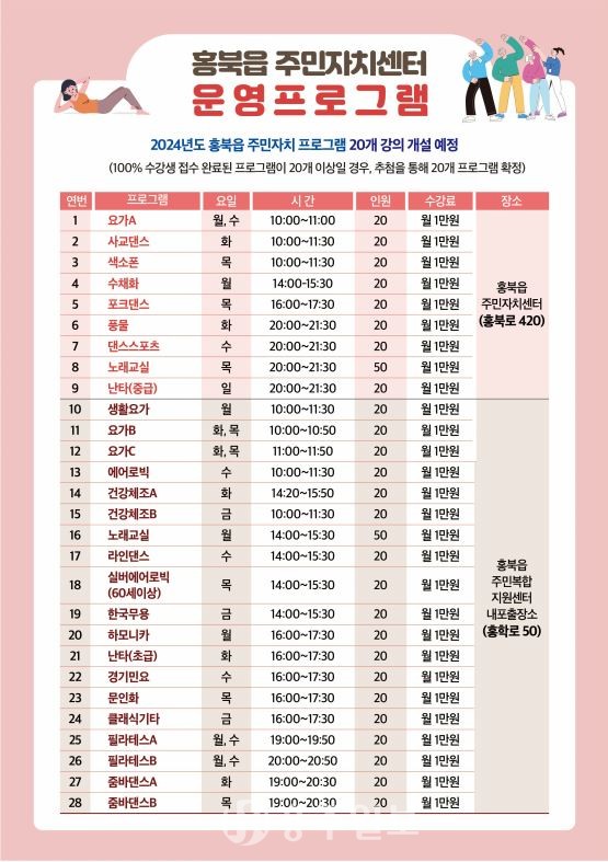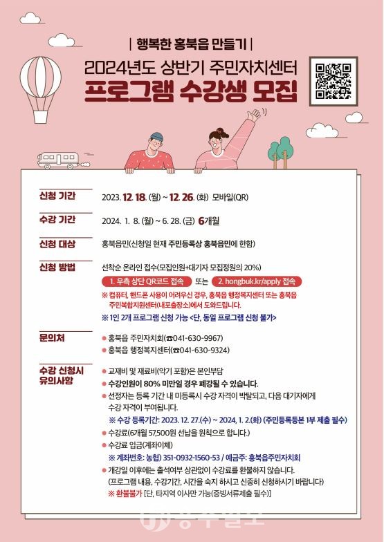 홍북읍주민자치회(회장 정윤)는 오는 18~26일까지 2024년도 상반기 홍북읍 주민자치프로그램 수강생을 모집한다고 밝혔다.