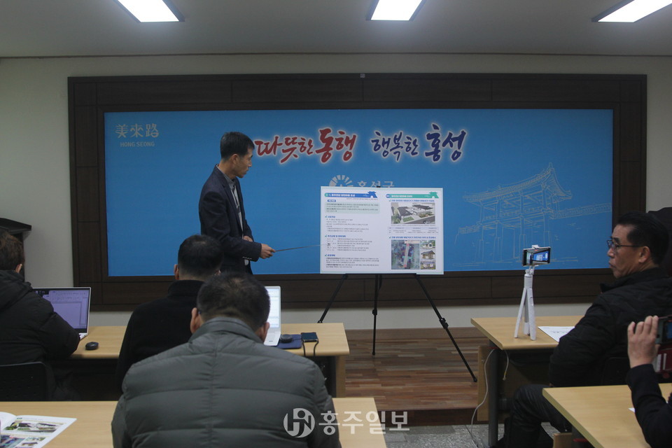 홍성군 문화관광과(과장 황선돈)는 19일 군청 내 언론브리핑실에서 관내 출입기자 20여 명이 참석한 가운데 홍주천년 양반마을 조성과 홍주읍성 복원·정비에 대한 언론브리핑을 가졌다.<사진>