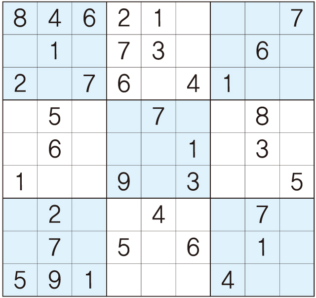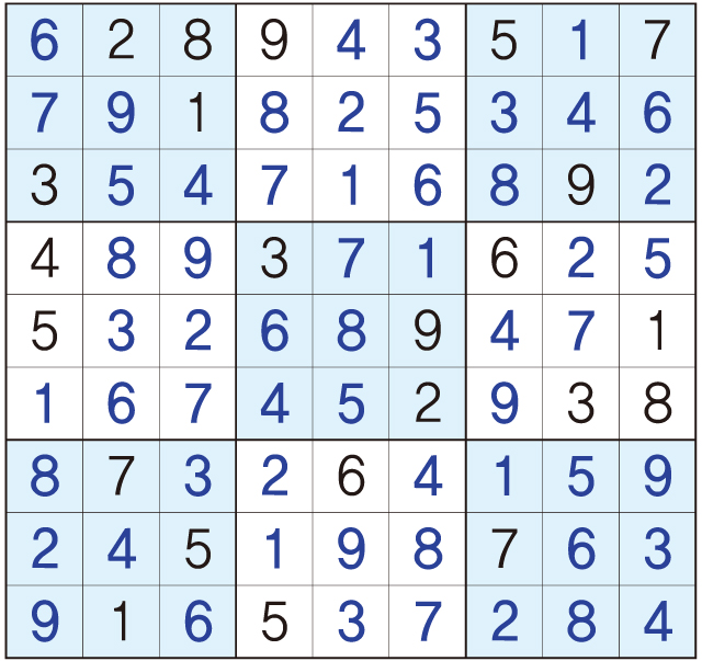 3. 큰 정사각형(9x9) 안에 있는 작은 정사각형(3x3) 안에는 숫자 1~9가 각 한 번씩 들어간다.