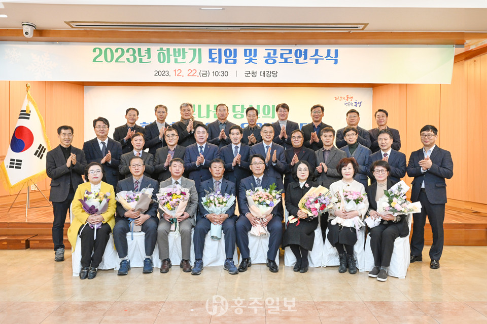 홍성군은 지난 22일 군청 대강당에서 퇴임·공로연수를 맞는 공직자들의 노고에 감사의 마음을 전하는 2023년 하반기 퇴임·공로연수식을 개최했다. 이날 행사는 퇴직자와 공로연수자, 이용록 홍성군수를 비롯해 가족·간부공무원, 직원 등 100여 명이 참석한 가운데 제2의 인생 출발을 앞둔 그들의 앞날을 응원했다. 2023년 하반기 정년퇴직자는 △김은희 공무직(행정지원과) △조명희 공무직(공공시설관리사업소) △정천영 공무직(홍성읍) 등 3명이며, 공로연수에 들어가는 공직자는 △김윤호 지역개발국장 △정채환 산림녹지과장 △유승진 보건행정과장 △강경숙 건강관리과장 △강선규 농업기술센터 친환경기술과장 △최인수 은하면장 △안인숙 보건소 서부보건지소관리팀장 △박정숙 보건소 구항보건지소관리팀장 △한상기 주무관(서부면)이다.