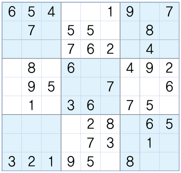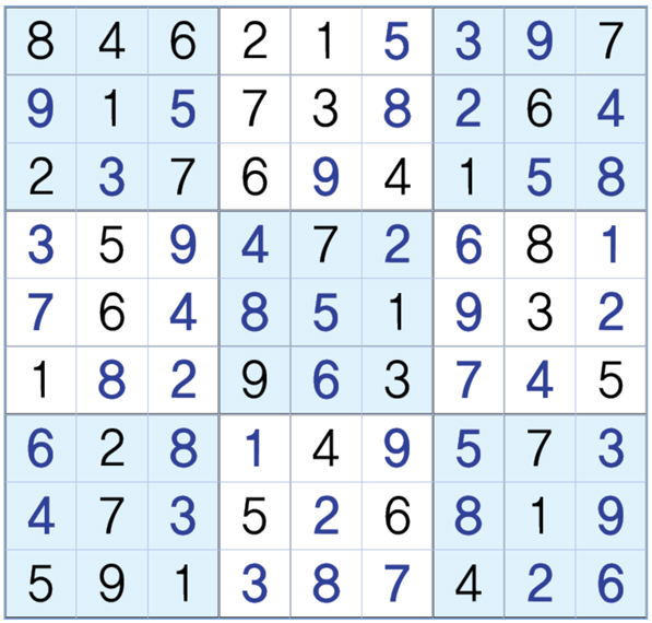 3. 큰 정사각형(9x9) 안에 있는 작은 정사각형(3x3) 안에는 숫자 1~9가 각 한 번씩 들어간다.