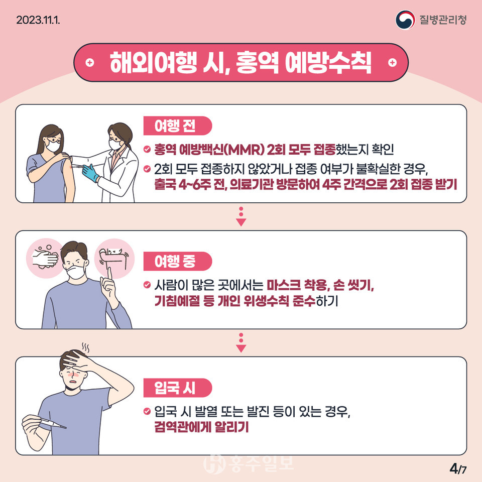 해외여행 전에는 홍역 예방백신(MMR) 2회 모두 접종했는지 확인해야 하며 2회 모두 접종하지 않았거나 접종 여부가 불확실한 경우 출국 4~6주 전 의료기관에 방문해 4주 간격으로 2회 접종받아야 한다.