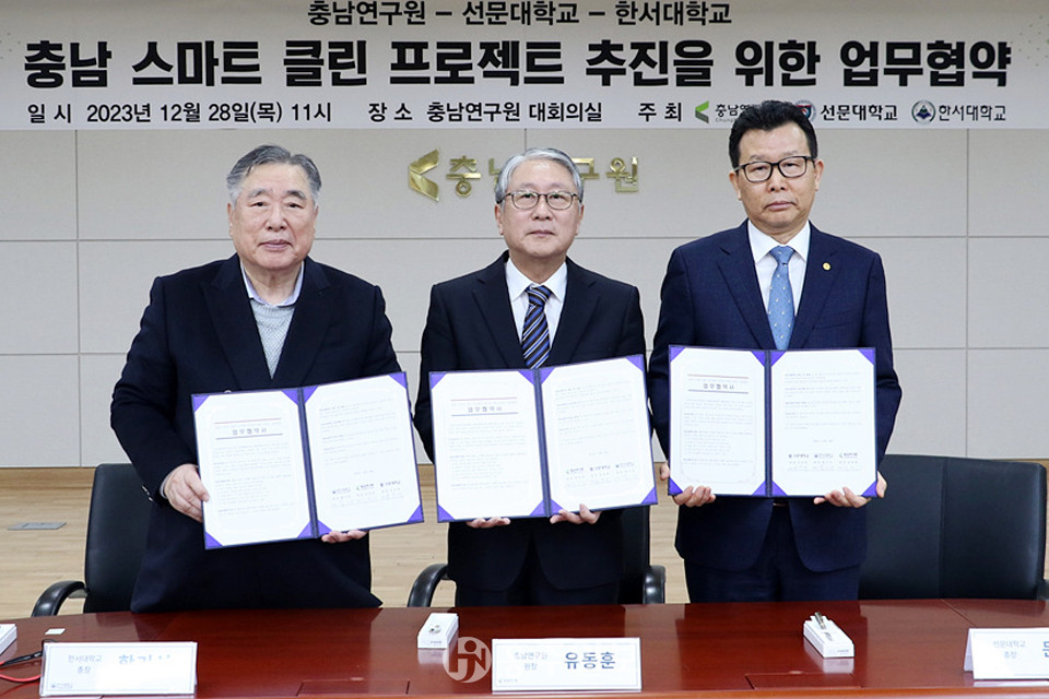 한서대학교(총장 함기선)와 충남연구원, 선문대 등 3개 기관은 지난해 12월 28일 충남연구원 대회의실에서 충남지역 내 환경오염 정화를 목표로 다양한 연구를 진행하는 ‘충남 스마트 프로젝트 추진을 위한 업무협약’을 체결했다.