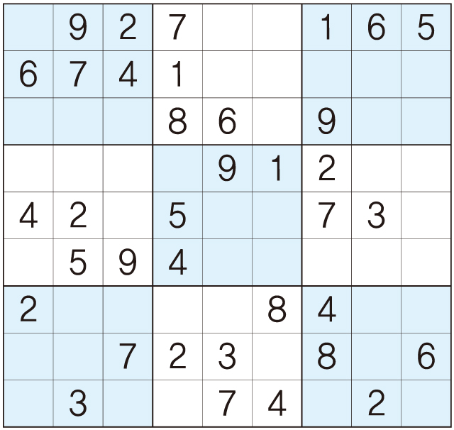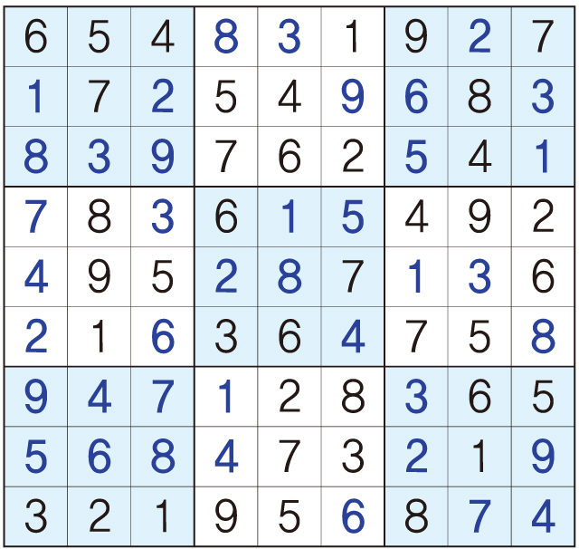 3. 큰 정사각형(9x9) 안에 있는 작은 정사각형(3x3) 안에는 숫자 1~9가 각 한 번씩 들어간다.