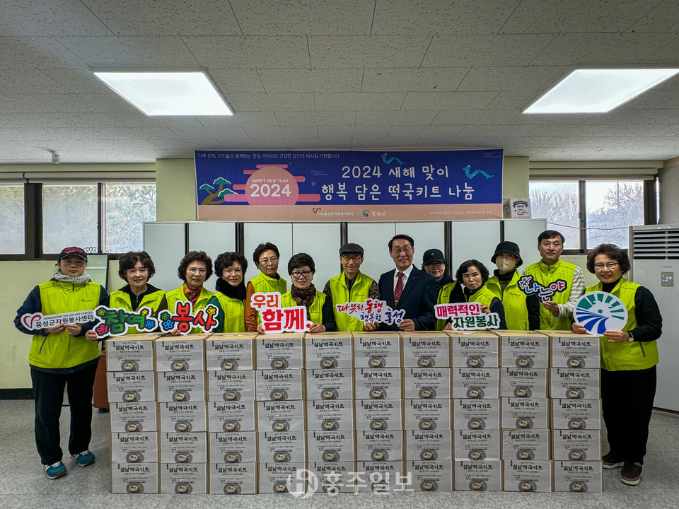 홍성군자원봉사센터는(센터장 방은희)는 갑진년 새해를 맞이해 지역 이웃들이 따뜻한 겨울을 날 수 있도록 지난 10일 홍성군자원봉사센터에서 소외계층 외에 환경정화 근로자, 폐지수거 근로자 등 지역사회의 보이지 않는 곳에서 열심히 일하고 있는 180가구를 대상으로 ‘새해맞이 행복 담은 떡국 키트’ 전달식 행사를 진행했다.<사진>