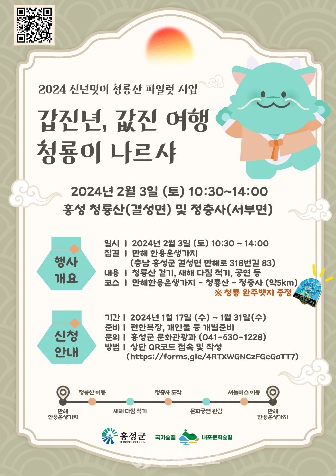 홍성군은 2024년 청룡의 해를 맞이해 희망과 활력을 전하고자 ‘갑진년, 값진 여행 청룡이 나르샤’라는 주제로 오는 2월 3일 ‘홍성 청룡산 걷기 행사’를 개최한다고 밝혔다.