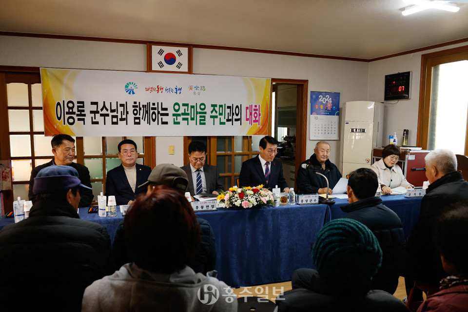 이어 29일 홍동면 운곡마을(이장 주정설) 회관에서 민생현장 방문 회의가 열렸다. 이용록 군수를 비롯해 서일원 홍동면장, 주용대 노인회장, 그리고 홍성군의회 장재석 부의장, 이정희·신동규 군의원 등 총 40여 명의 마을 주민들이 참석한 가운데 민생현장 방문 회의가 개최됐다.