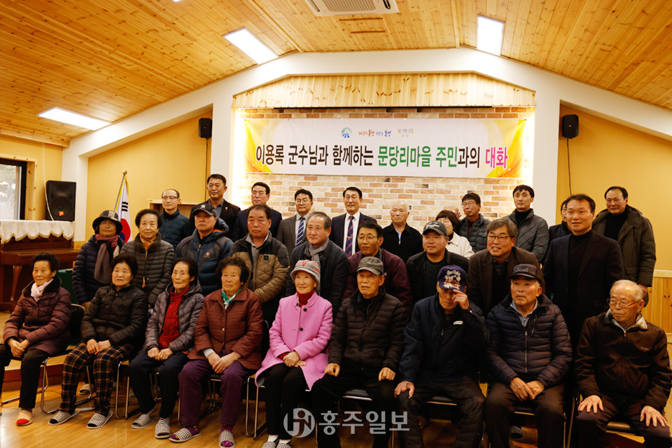 이어진 회의에서 이용록 군수가 홍동면 문당환경농업정보화 마을 회의실에서 개최된 문산마을(이장 이선재) 주민들과 소통하는 자리가 마련됐다. 주민들은 마을 하천 배수로로 인한 고생과 홍동면의 유기농 메카 이미지와는 다르게 일부 주민들이 하천의 용수 부족으로 인해 유기농·친환경 농법을 접는 현실에 대한 우려를 군수에게 직접 전했다.