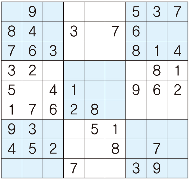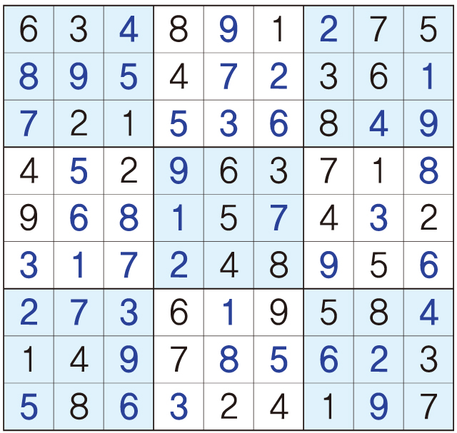 3. 큰 정사각형(9x9) 안에 있는 작은 정사각형(3x3) 안에는 숫자 1~9가 각 한 번씩 들어간다.