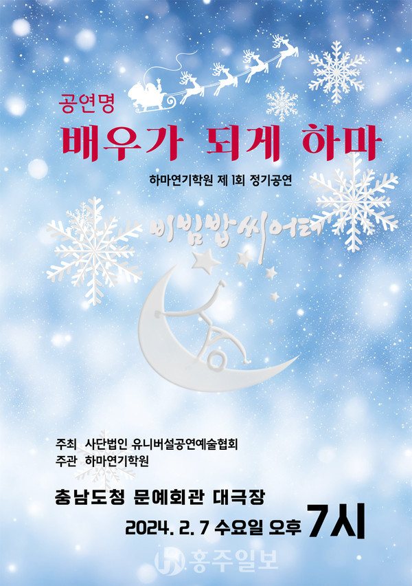 사단법인 유니버설공연예술협회가 주최하고 내포신도시 하마연기학원(원장 황수경)이 주관한 ‘제1회 하마연기학원 정기공연 <배우가 되게 하마>’가 오는 7일 오후 7시 충남도청 문예회관 대극장에서 펼쳐진다.