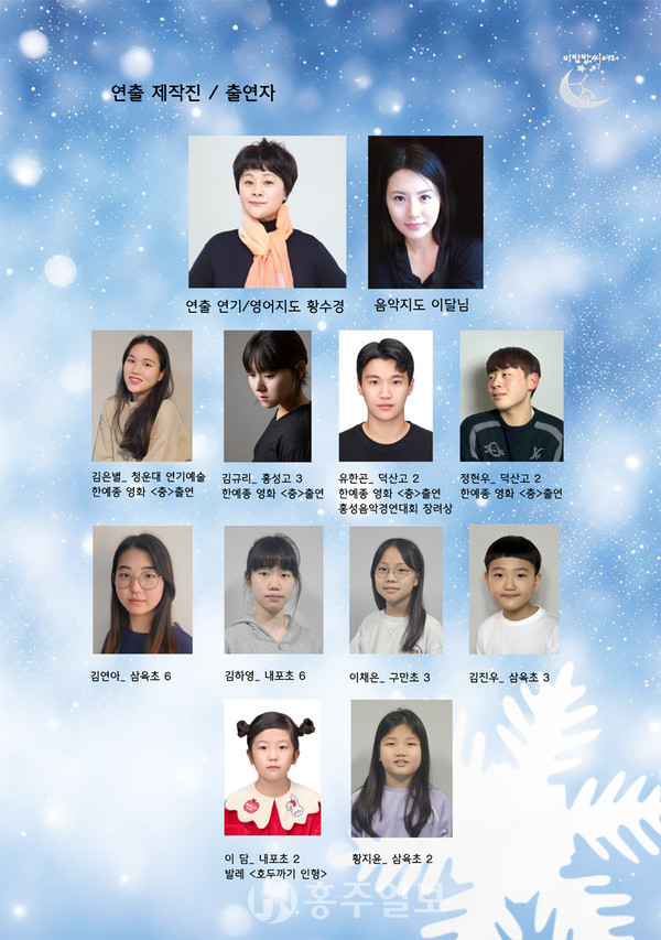 종합예술영역인 연극과 뮤지컬의 기량을 익힌 홍성·예산지역 학생들이 그동안 갈고 닦은 실력을 점검하고 앞으로 더 나아가기 위해 ㈜홍주일보사(대표이사 한관우)의 후원으로 개최되는 이번 정기공연에는 30여 년 뮤지컬계에 몸 담으며 뮤지컬 ‘넌센스’ 등 수많은 작품의 중심에 섰던 황수경 원장이 연출 연기와 영어지도를 맡았으며 △김은별(청운대1) △김규리(홍성고3) △유한곤(덕산고2) △정현우(덕산고2) △김연아(삼육초6) △김하영(내포초6) △이채은(구만초3) △김진우(삼육초3) △이담(내포초2) △황지윤(삼육초2) 등 우리지역 학생배우들이 배우로 참여한다.