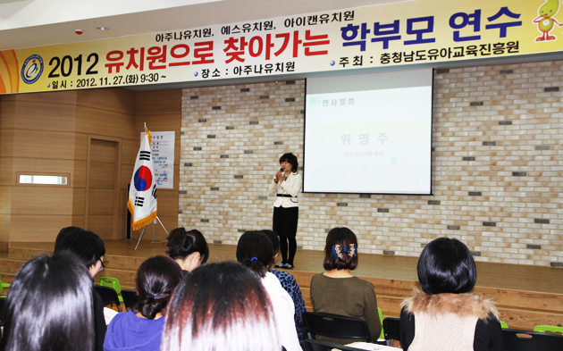 충청남도유아교육진흥원(원장 김화희)은 지난 27일 아산시에 소재한 아주나유치원(원장 위명주)에서 아주나유치원, 예스유치원, 아이캔유치원 등 3개 유치원 130여명의 학부모가 참여하는 가운데 '2012 유치원으로 찾아가는 학부모 연수'를 실시했다.