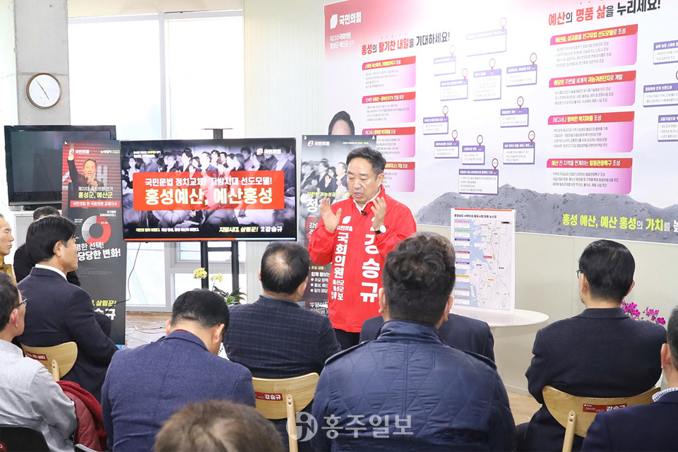 국민의힘 강승규 예비후보가 지난 14일 오후 5시 선거사무소에서 예비홍보물로 선보인 지역별 정책에 대한 첫 번째 정책설명회를 진행했다.<사진>