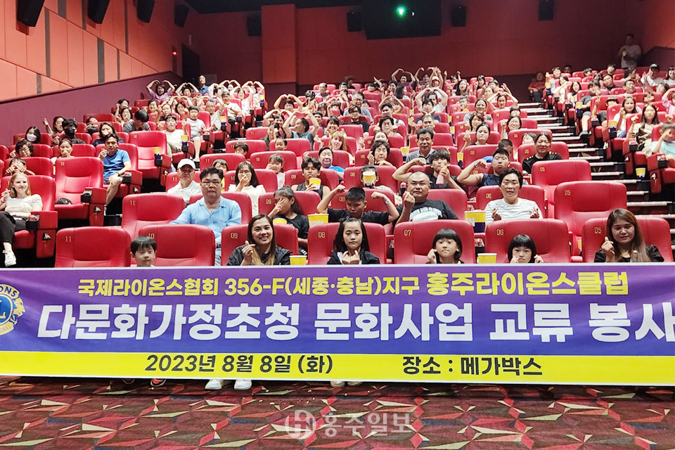 홍주라이온스클럽(회장 김헌수)은 지난 8일 메가박스 홍성내포에서 8개국 120명의 관내 다문화가족을 초청해 클럽회원 60명과 함께 문화사업 교류 봉사의 일환으로 영화관람을 실시했다.