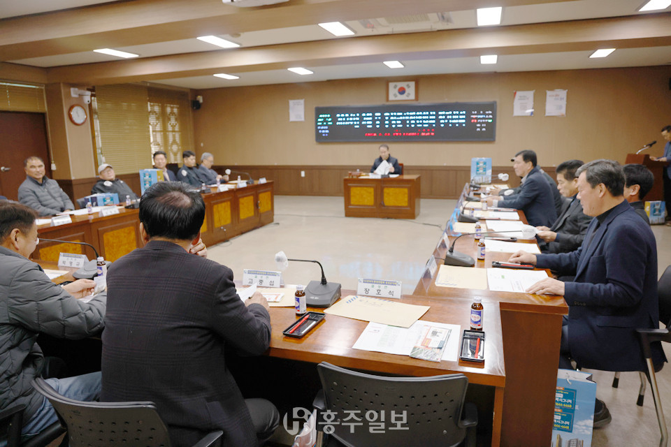 홍성군이장연합회(회장 홍성은)는 21일 군청 회의실 2층에서 각 읍면 이장 등 15명이 참석한 가운데 회의를 진행했다.<사진>