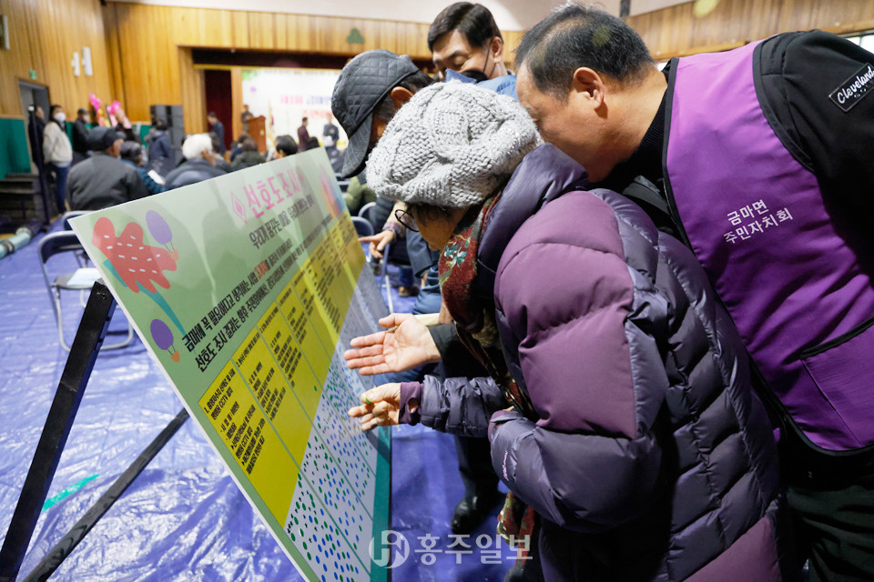 이와 함께 △홍양저수지 산책로 및 주변 시설 방범용 CCTV 설치 △유기농 홍성 딸기로 건강백세를! 사업 △금마면 주민 문패 및 우체통 설치 △놀이로 만나는 금마면 꿈나무 문화의 날 △소식지 금마소담이(금마면 소식을 담은 이야기) 제작 △증손자까지 함께하는 4代 행복회관 조성 △국도변 마을진입로 입구 방범용 CCTV 설치 △어르신을 위한 마을회관 안전의자 보급 △맨발 걷기 황토길 조성 등 11개 의제가 골고루 주민들의 표를 받았다.