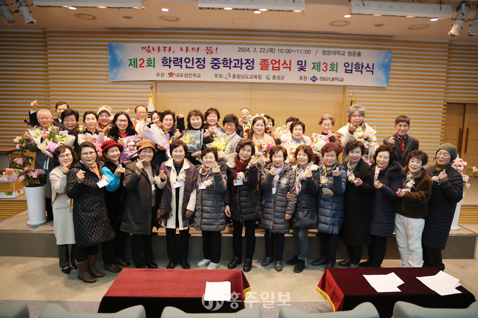 내포인성학교(교장 최광묵)는 지난 22일 청운대학교 대학본부 청운홀에서 졸업생·입학생과 가족, 조광희 부군수, 정윤 청운대학교 총장 등 80여 명이 참석한 가운데 졸업식과 입학식을 성공적으로 개최했다.<사진>