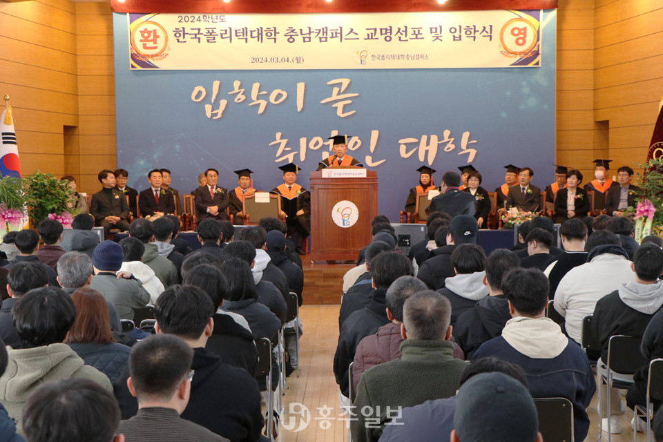 한국폴리텍대학 충남캠퍼스(학장 김현철)가 지난 4일 대학본부 3층 대강당에서 2024학년도 신입생 입학식 및 교명 선포식을 거행했다.<사진>