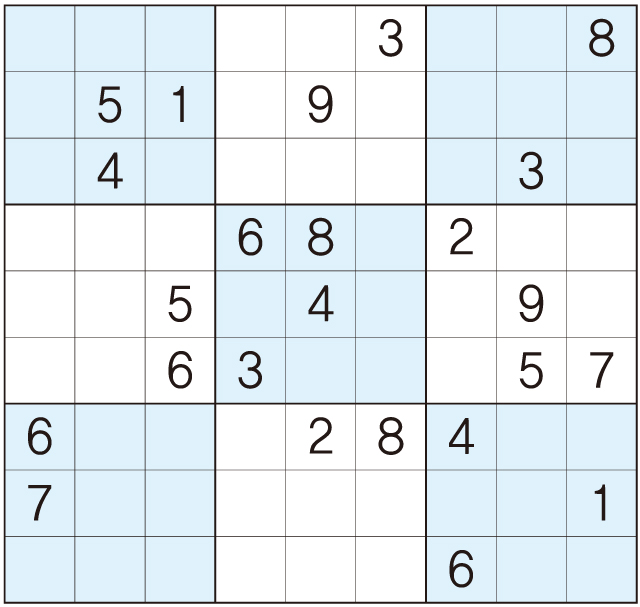 3. 큰 정사각형(9x9) 안에 있는 작은 정사각형(3x3) 안에는 숫자 1~9가 각 한 번씩 들어간다.