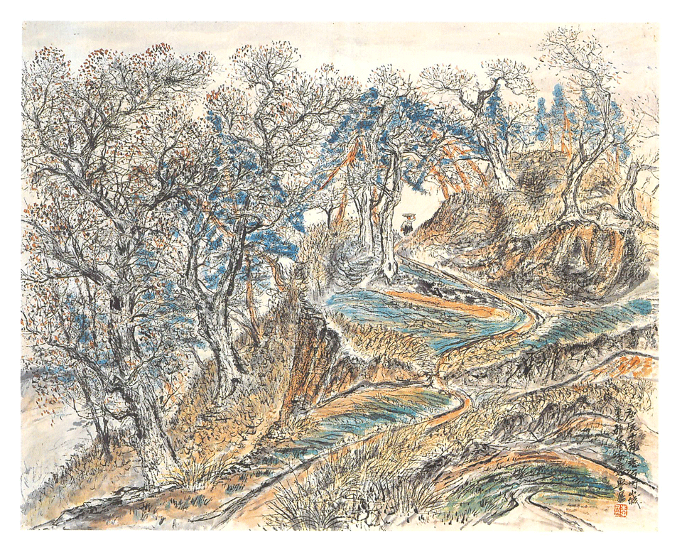 왼편의 나무 숲이 우거진 공간과 오른편으로 구불구불 S자 곡선의 작은 길로 공간을 구획했다. 왼편에 위치한 나무들은 압도적인 크기로 화면에 등장하며 빽빽한 숲의 느낌을 주고, 나무들은 짙은 먹으로 나무의 골격을 형성하고 메마른 붓질로는 울긋불긋한 가을 낙엽의 정취를 담아냈다.