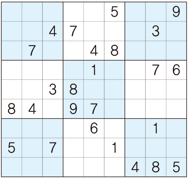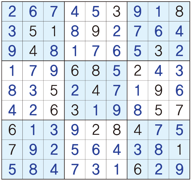 3. 큰 정사각형(9x9) 안에 있는 작은 정사각형(3x3) 안에는 숫자 1~9가 각 한 번씩 들어간다.