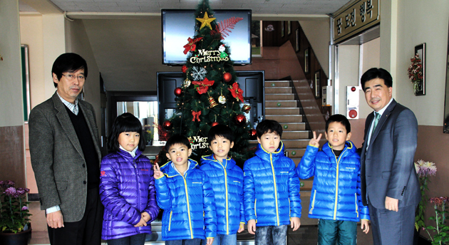 ▲ 결성초등학교(교장 복기헌) 총동창회 임승한(농협 충남본부장) 회장은 지난달 30일 후배들이 따뜻한 겨울을 보낼 수 있도록 전교생에게 300만원 상당의 방한복을 전달했다. 이날 임승한 농협 본부장을 대신해 전달한 백남성 농협충남본부 금융마케팅팀장은 "농협의 농산어촌교육에 대한 관심과 본부장님의 모교사랑이 융합되어 지원하게 되었다"면서 지속적으로 농산어촌학교에 대한 지원 의사를 밝혔다. 복기헌 교장은 "총동창회장을 맡으면서 모교에 많은 관심을 애정을 갖고 계시는데, 이렇게 후배들을 위해 좋을 일까지 해주셨다"는 감사의 말을 전했다. <사진 왼쪽부터 결성초 복기헌 교장, 2학년 학생들, 백남성 농협충남본부 팀장>