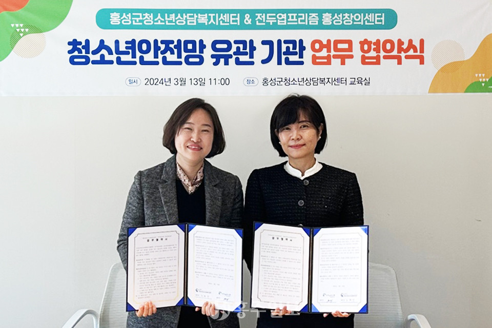 홍성군청소년상담복지센터(센터장 조현정)는 전두엽프리즘 홍성창의센터(센터장 백현주)와 지난 13일 홍성군 위기 청소년과 아동이 건강하게 성장할 수 있도록 상호 협력하고자 업무협약을 체결했다.<사진>