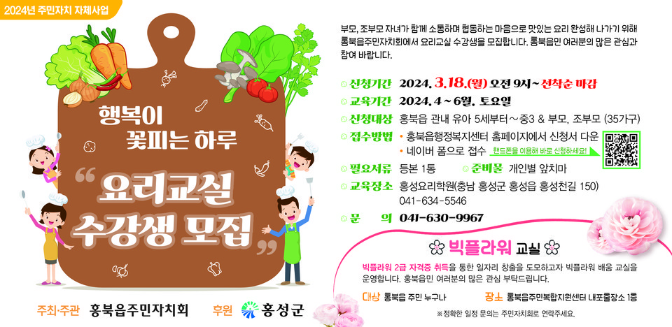 주민자치 자체 사업은 △‘행복이 꽃피는 하루’ 어린이 인성 교육 △요리교실 △다도교실 등으로 구성돼 있으며, 특히 요리교실은 만 5세~중3까지의 유아, 청소년, 부모, 조부모 등 35가정을 모집해 홍성요리학원에서 4월부터 6월까지 토요일 오전·오후 70회로 진행한다.