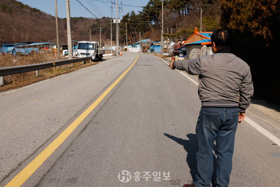 이 구간은 매일같이 승용차뿐만 아니라 레미콘, 덤프 차량 등 크고작은 차량들이 빠른 속도로 통행하는데, 이로 인해 도로 갓길로 걷는 마을주민과 보행기 실버카로 이동하는 어르신들의 걱정이 이만저만이 아니에요. 이러한 상황에서 마을주민들은 교통사고로 인한 자동차 울렁증을 겪기도 하지요. 그렇기 때문에 갈산면이나 홍성군에서 마을 앞길에 과속단속 카메라나 방지턱을 설치해 교통 위험으로부터 해방될 수 있도록 현장점검을 통해 안전 대책을 수립할 필요가 있습니다.