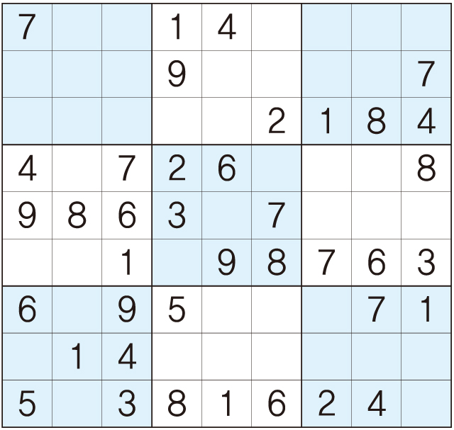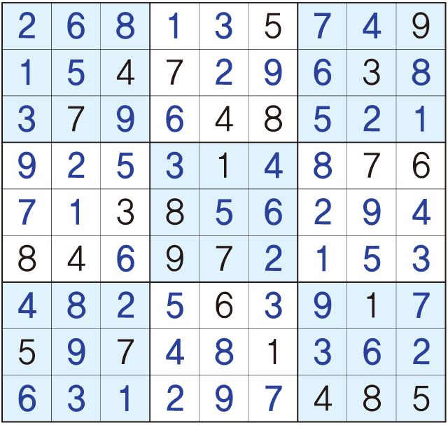 3. 큰 정사각형(9x9) 안에 있는 작은 정사각형(3x3) 안에는 숫자 1~9가 각 한 번씩 들어간다.