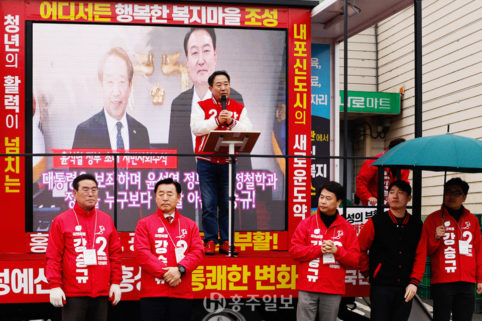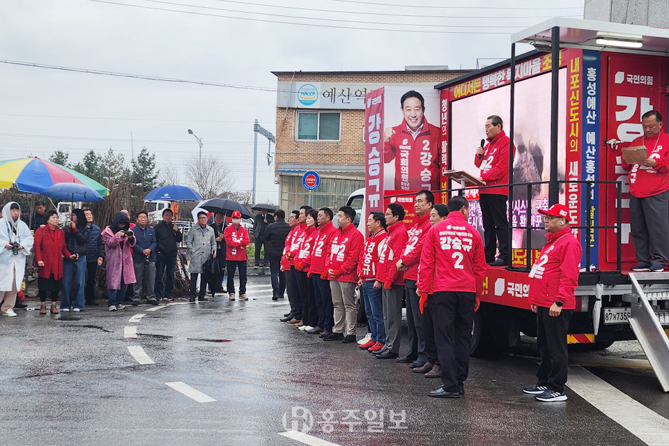 강승규 국민의힘 후보가 28일 홍성군과 예산군에서 각각 출정식을 가졌다.