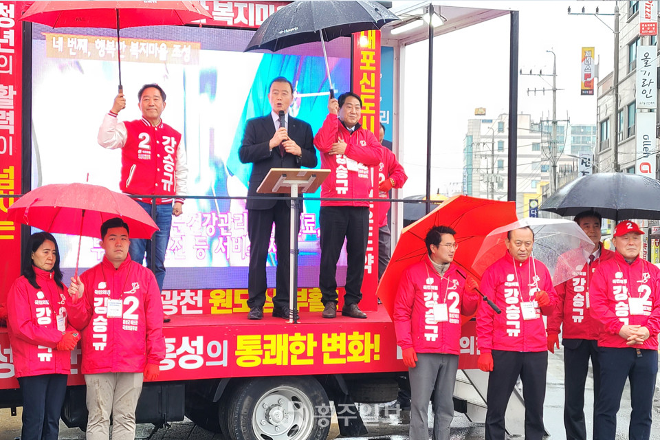 강승규 후보는 “현직 4선 의원인 홍문표 의원이 지난 30년간 이룬 지역발전과 보수의 성지로 일군 성과에 감사드린다”는 말을 시작으로 본격적인 유세를 펼쳤다.
