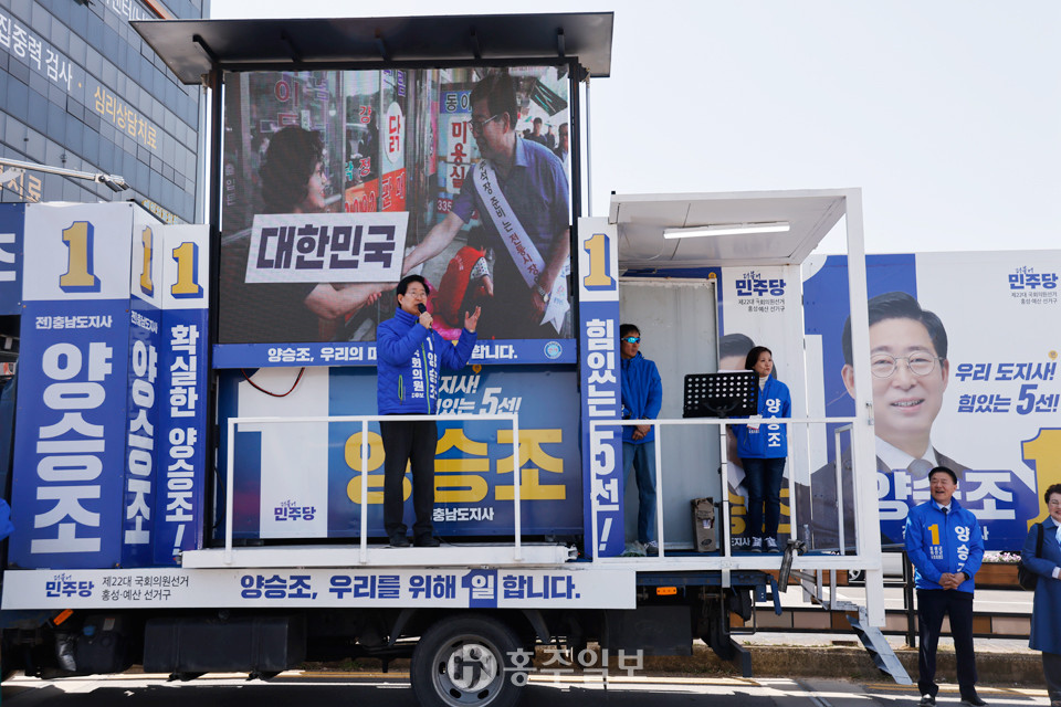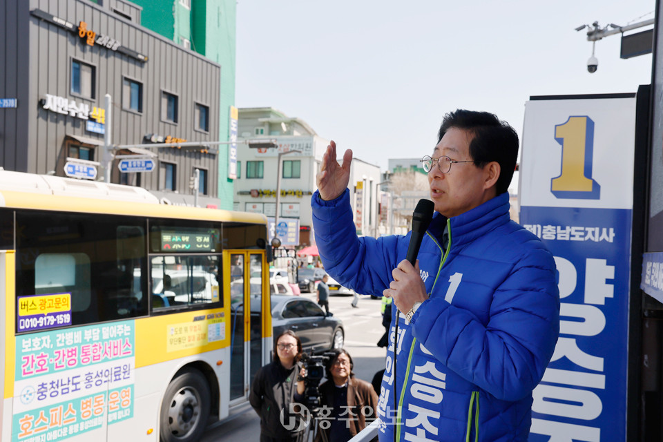 양승조 더불어민주당 후보가 1일 홍성읍 홍성전통시장 일원에서 유세 연설을 진행하며 “윤석열 정부에 대한 심판론”을 강조했다.<사진>