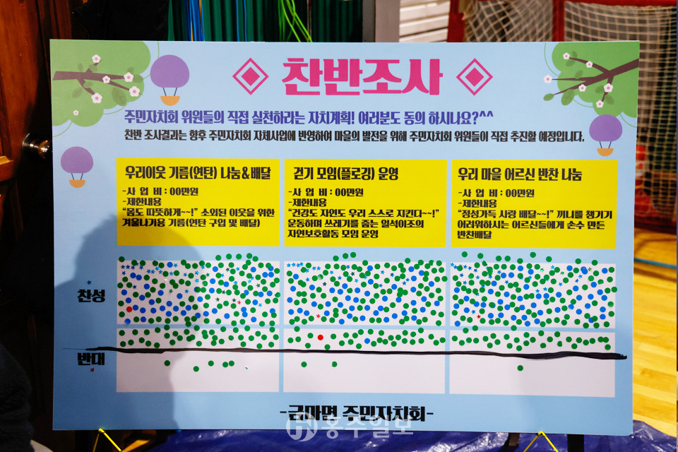한 찬반조사 투표를 통해 △우리 이웃 기름(연탄) 나눔·배달 △걷기 모임(플로깅) 운영 △우리 마을 어르신 반찬 나눔 사업이 모두 통과됐다.