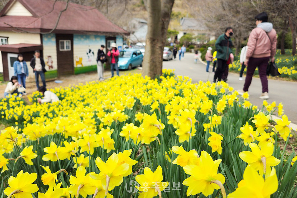 봄의 전령사인 수선화가 노란 꽃망울을 터뜨리며 구항 보개산 자락 내현리 거북이마을에서 들려오는 꽃노래가 논밭 들길을 따라 한창이다. 구항면 내현리 구산사 일원에서 지난달 30일부터 31일까지 ‘제2회 구항 내현리 거북이마을 수선화 축제’가 개최됐다. 이번 축제는 수선화 꽃길 걷기, 부보상 마당극 ‘장타령’, 수선화 심기 무료 체험, 먹거리 등 다양한 프로그램이 준비됐다.<사진>