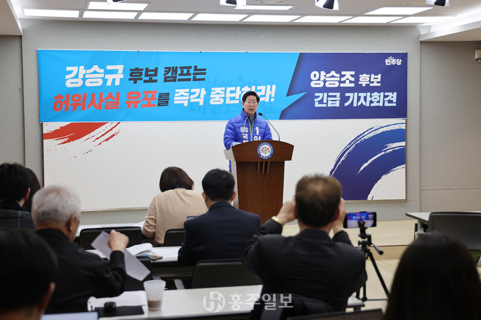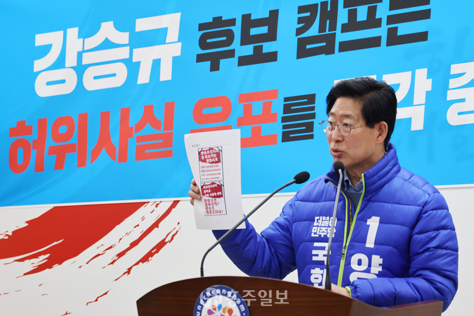 계속해서 양 후보는 “강승규 후보의 허위사실 유포뿐만 아니라 조직적으로 이러한 내용의 선전물이 SNS에서 유통되고 있다”고 주장한 뒤 “선거 결과와 무관하게 사법기관의 힘을 빌어서라도 끝까지 이러한 허위사실 유포에 대해 엄중한 책임을 묻겠다”고 경고했다.