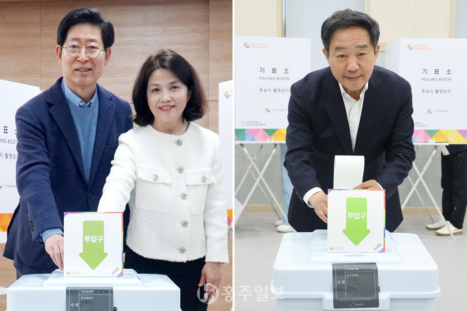 김태흠 충남도지사(사진 왼쪽)와 김지철 충남교육감 내외(사진 오른쪽)가 5일 오전 홍북읍사전투표소에서 사전투표를 실시했다.