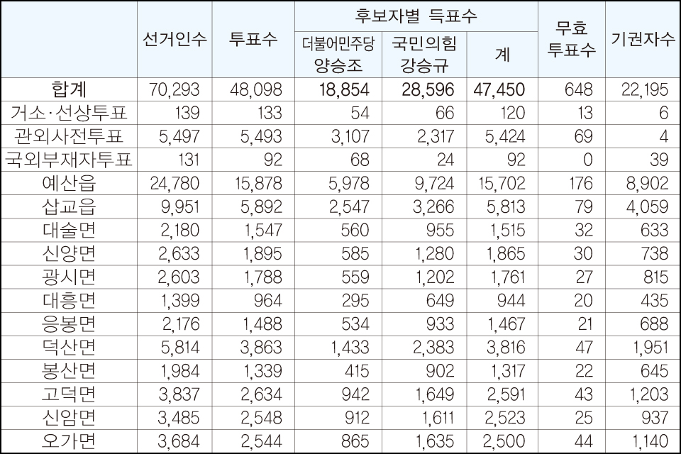 반면 예산군에서는 강승규 후보가 2만 8596표(60.26%)를 득표했고, 양승조 후보가 1만 8854표(39.73%)를 득표해 강 후보가 무려 9742표를 더 득표하면서 승패가 갈렸다.