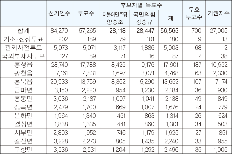 홍성군에서는 강승규 후보가 2만 8447표(50.29%)를 득표했고, 양승조 후보가 2만 8118표(45.15%)를 득표해 강 후보가 단 329표를 더 얻으며 초박빙 접전을 펼쳤다.