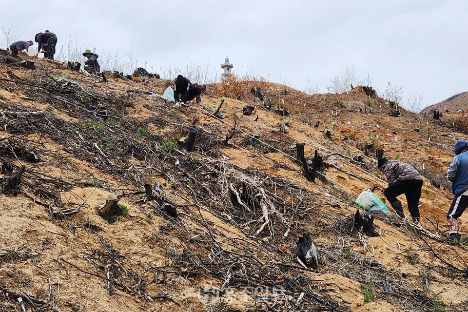 홍성산불이 발생한 지 1년이 지난 후, 다시 찾은 산불현장에서는 여전히 불에 탄 나무를 자르는 벌목작업이 진행되고 있었다. 벌목이 끝난 일부 산지에서는 소나무 묘목을 심고 있는 장면이 목격됐다. 주민들은 “산불 트라우마는 여전히 남아 있지만 조금씩 일상을 회복하고 있다”고 말했다."