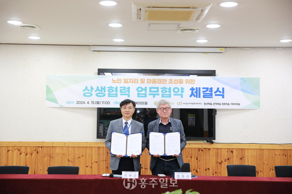 홍성사회복지관(관장 오왕근)과 ㈔홍성지역협력네트워크(이사장 염창선)는 15일 구항면 거북이마을에서 노인일자리 사업과 마을경관 조성을 위한 상생협력 업무협약식(MOU)을 가졌다.<사진>