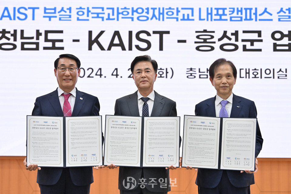 김태흠 충남지사와 이광형 KAIST 총장, 이용록 홍성군수는 지난 23일 도청 대회의실에서 ‘한국과학영재학교 내포캠퍼스 설립 등을 위한 업무협약’을 체결했다.