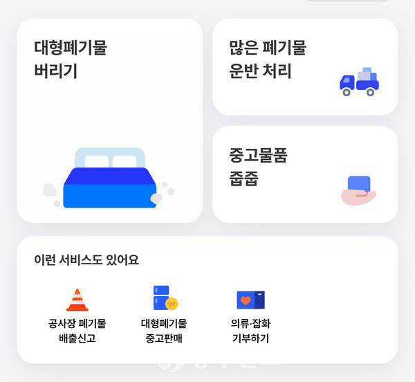 앱 내에서 수거장소를 입력·배출하고 품목 사진을 업로드 후 카드 결제해 배출장소에 대형폐기물을 내놓으면 수거업체가 수거·처리하는데 이 모든 과정은 앱에서 확인할 수 있어요.