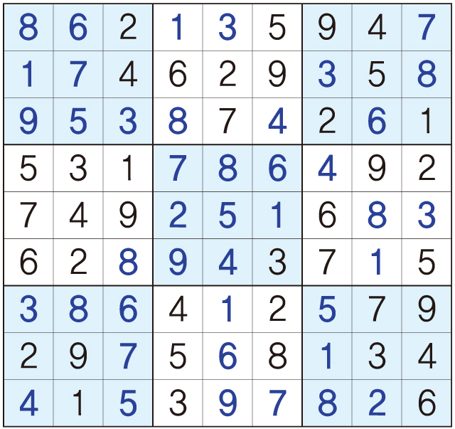 3. 큰 정사각형(9x9) 안에 있는 작은 정사각형(3x3) 안에는 숫자 1~9가 각 한 번씩 들어간다.
