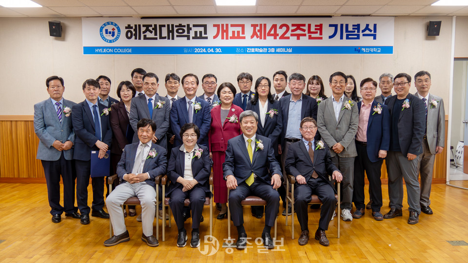 혜전대학교(총장 이혜숙)는 지난달 30일 간호학술관 세미나실에서 이준호 이사장과 이혜숙 총장을 비롯한 교직원과 수상자 등 120여 명이 참석한 가운데 ‘개교 42주년 기념식’을 개최했다. <사진>