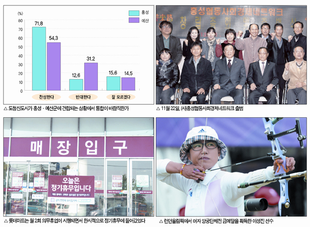 본지가 창간특집으로 지난 6월 11~12일 여론조사 전문기관인 더피플에 의뢰해 19세 이상 홍성군민 800명(표본오차는 95%±3.4p신뢰구간에 응답율 6.7%)을 대상으로, 예산군민 812명(표본오차는 95%±3.4p신뢰구간에 응답율 6.8%)을 대상으로 각각 전화여론조사를 실시한 결과 충남도청 청사 입주를 앞둔 상황에서 홍성군과 예산군이 서로 통합하는 것이 바람직하다는 의견에 대해서 홍성군민 71.8%, 예산군민 54.3%가 찬성의견을 보이는 것으로 조사됐다. 이는 2013년 내포신도시로의 도청이전이 성공적으로 이뤄지기 위해 무엇보다 행정관리 문제가 해소돼야 한다는 것에 군민들의 의견이 모아졌기 때문이라는 분석이다.