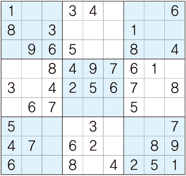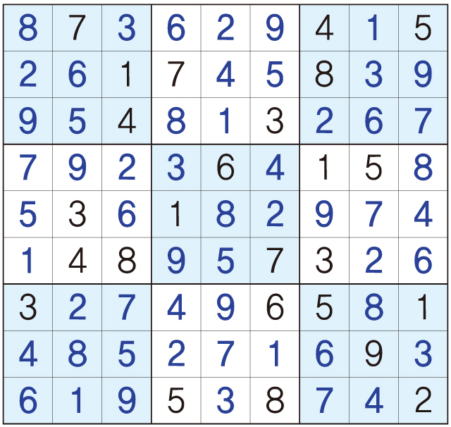 3. 큰 정사각형(9x9) 안에 있는 작은 정사각형(3x3) 안에는 숫자 1~9가 각 한 번씩 들어간다.