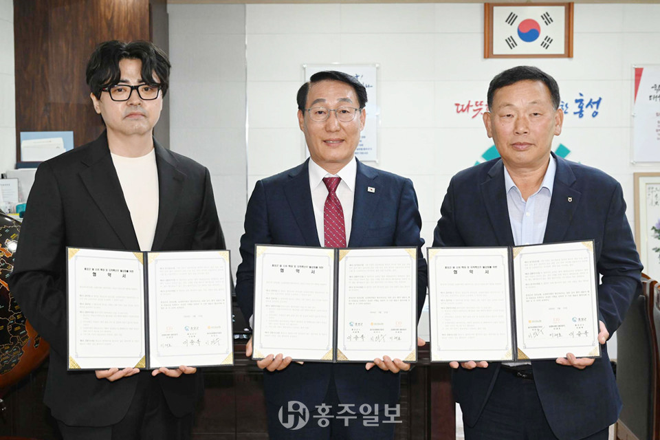 홍성군은 21일 쌀 소비 촉진과 지역 특산주 활성화를 위해 갈산농업협동조합(조합장 이의수), 농업회사법인 팔로미㈜(대표이사 이재호)와 업무협약을 체결했다.<사진>